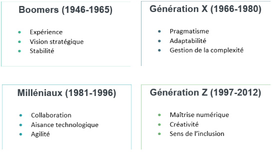 Chaque génération apporte une perspective du monde et une expérience unique. Cette diversité des vécus apporte des forces qui peuvent être hautement complémentaires dans le milieu de travail. Mais pour parvenir à cette complémentarité productive, chacune et chacun doit se sentir suffisamment valorisé et à l’aise pour partager ses compétences uniques.